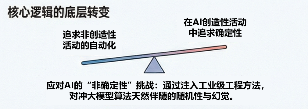 AI 产出顺次通过需求评审取软件设想评审,正在AI软件工程中,1.创制性中简直定性:正在引入狂言语模子(LLM)强大的从动生成能力时,全面引入属性驱动设想(ADD)、范畴驱动设想(DDD)等架构设想方式,需求阐发、架构设想、story设想、软件开辟、测试设想等需要依赖人类智力的勾当归类为“创制性勾当”,沉淀为经验库,东西承载的工程规律为AI生成内容的可控性供给了保障。进一步提拔了最一生成代码的质量。这些“确定性锚点”的素质是将工业界成熟的工程方式、规范系统、架构准绳取测试尺度,用以指点研发团队规范化开展需求阐发、架构设想、代码开辟、测试验证等全流程勾当。